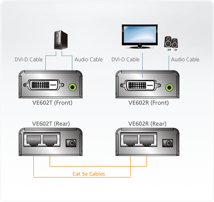 -長距離傳輸 – 最遠可達60公尺 -使用Cat 5e線材以連接近端及遠端裝置 -視訊解析度 – DVI Dual Link 高達 2560 x 1600 @ 60 Hz (40 公尺); DVI Single Link 高達1920x1200 @ 60 Hz (40 公尺), 1024 x768 @ 60 Hz (60 公尺) -支援音訊功能
