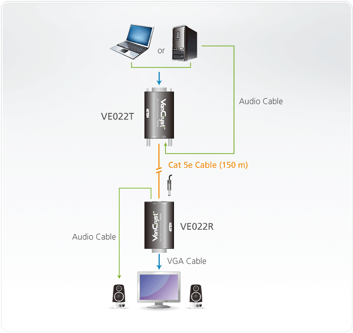 VE022迷你型 Cat 5 影音訊號延長器能提供使用者簡便的連接方式以取代沉重且昂貴的VGA線材,僅需使用一條Cat 5e連接線材,即可將影音訊號來源設備與顯示螢幕之間的距離延伸最遠達150公尺。