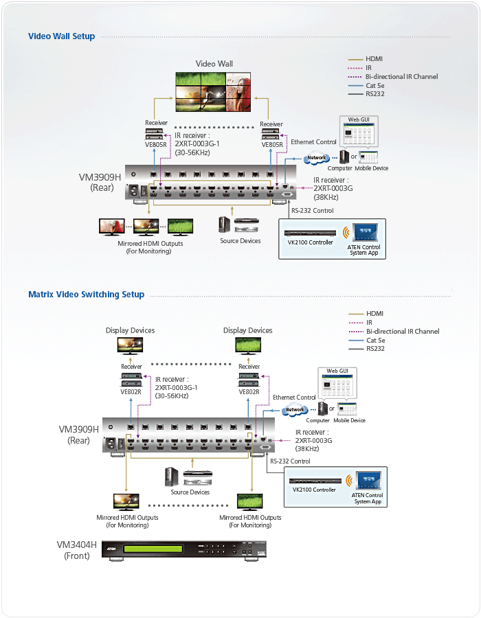 VM3404H可以透過前面板按鍵、IR遙控器、RS-232控制器以及乙太網路連線(Telnet / 網路圖形化使用者介面)來控制,達到具彈性且穩定的影音訊號分送。此款矩陣式影音切換器為一套實用而整合的影音控制系統,可適用於一般家用、商業和會議中心等各式應用。