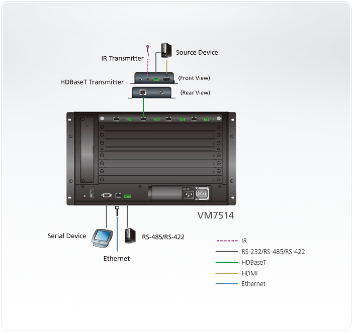 VM7514 4埠HDBaseT輸入板卡,搭配ATEN模組化矩陣式切換器,可發送及分配任意4組HDBaseT傳送器傳送至4組HDBaseT接收器,高達任意32組HDBaseT的連結。