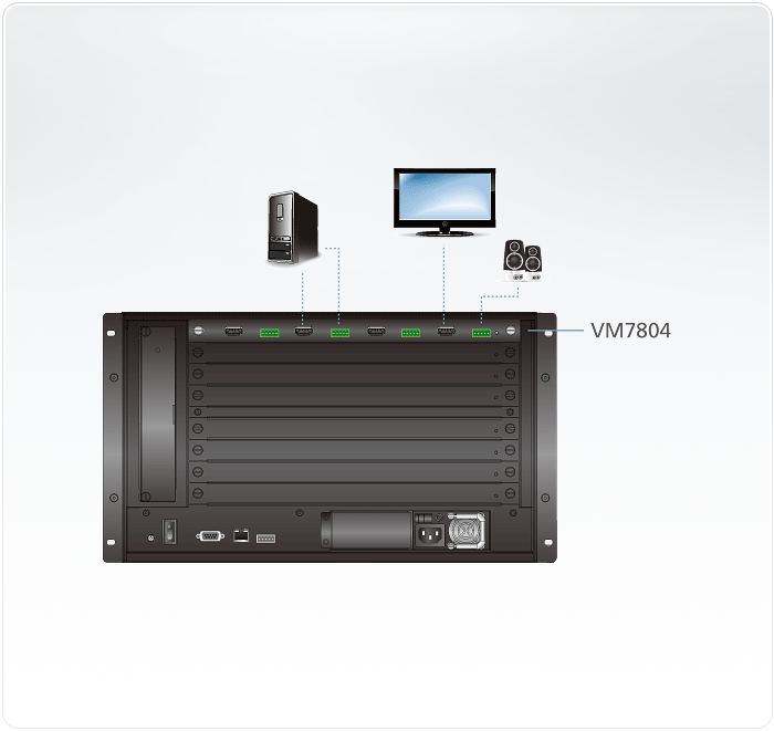 VM7804 4埠HDMI輸入板卡為熱插拔設計,搭配ATEN 模組化矩陣式視訊切換器可發送及分配任意4組影/音來源端裝置至任意4組顯示端裝置。