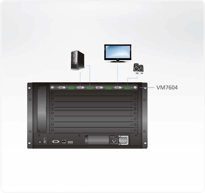 VM7604 4 埠DVI 輸入板卡為熱插拔設計,搭配ATEN 模組化矩陣式視訊切換器可發送及分配任意4 組影/ 音來源端裝置至任意4 組顯示端裝置。