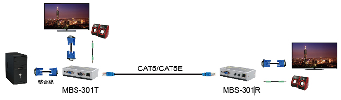 -VGA 影音訊號 ( VGA+Audio ) CAT5 延長器 -可將 VGA 訊號做延長,最遠可達 300 公尺 -適合各種需要將 VGA 影音訊號延長及同步播放的場合使用