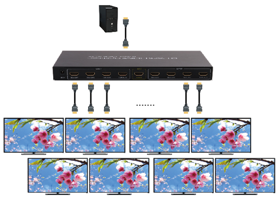 這一款 HDMI 影音訊號分配器,能將輸入的 HDMI 影音訊號透過 HDMI 標準纜線,可以同步輸出 8 組
