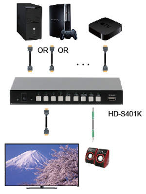 -HDMI 訊號無縫切換器 -可快速切換 4 組不同的 HDMI 數位訊號,使用面板按鍵、遙控器或 RS-232 切換 -支援 1 組類比音源 ( 3.5mm Jack ) 輸出 -支援輸出最高解析度 4K2K@30Hz