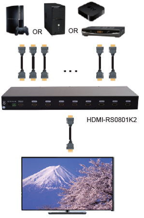 ● 可供 8 組輸入的 HDMI 數位影音訊號,切換輸出至 1 台顯示器上播放。
