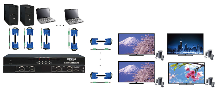 ● 可將 4 組 ( VGA+Audio ) 影音訊號,任意切換輸出到 4 台顯示器及喇叭中的一台上播放。