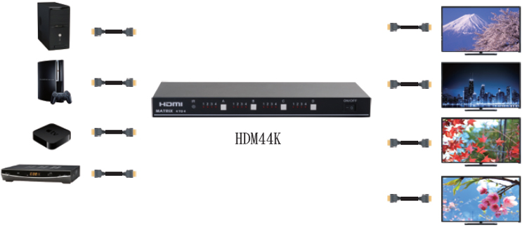 這一款 4x4 HDMI 影音矩陣切換器,可以同時輸入 4 組 不同的 HDMI 訊號 ( 例:藍光播放器、