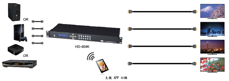 透過面板按鍵、紅外線遙控、RS-232、Web、APP...等方式來作切換,可以讓您輕鬆切換不同