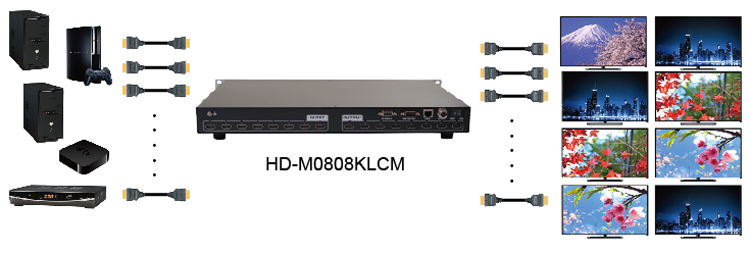 -8x8 HDMI 影音矩陣切換器 -可以同時輸入 8 組 不同的 HDMI 訊號 -並使用 8 條 HDMI 標準纜線連接到 8 台顯示器 -透過面板按鍵、紅外線遙控、RS-232、TCP/IP...等切換操控 -適合用於飯店、百貨公司、視聽影音賣場、活動展場使用