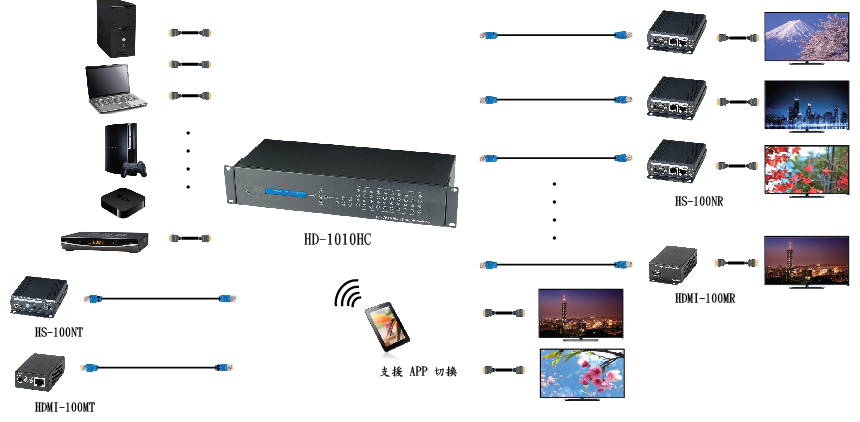 HDMI 標準纜線輸出到 10 台顯示器 ( HDMI x 2 ,HDBaseT x 8 ),可做任意的切換選擇,