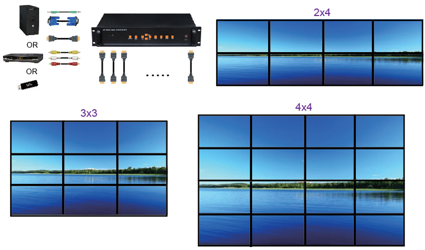 這一款設備支援 4 組輸入 ( 1 組 VGA、1組 HDMI、1組 AV、1組 USB ),輸出拼接為 4 X 4 電視牆,
