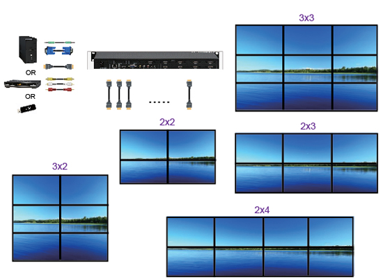 -支援 4 組輸入 ( 1 組 VGA、1組 HDMI、1組 AV、1組 USB ) -輸出拼接為3 X 3 電視牆 -解析度可高達 1920x1080@60Hz -適用於各大賣場、百貨公司、展場...等使用。