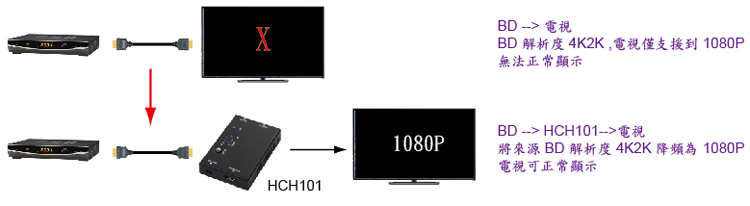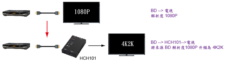 - HDMI 訊號升頻器 -可使 HDMI 輸入訊號解析度升頻到 4K2K 或降頻為 1080P -具訊號重整放大功能可使畫面正常顯示 -常使用在需將 HDMI 訊號解析度固定在 4K 或 1080P 時使用