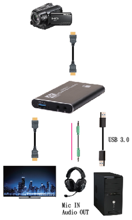 -HDMI TO USB 3.0 影音擷取器 -將輸入的 HDMI 影音訊號透過 USB 3.0 擷取至電腦上,並 同步一組 HDMI 訊號近端輸出 -可監看即時畫面 -支援最高解析度 ( 輸入 4K@60Hz / 輸出 1080p@60Hz ) -支援系統 Windows、Linux、Mac OS X